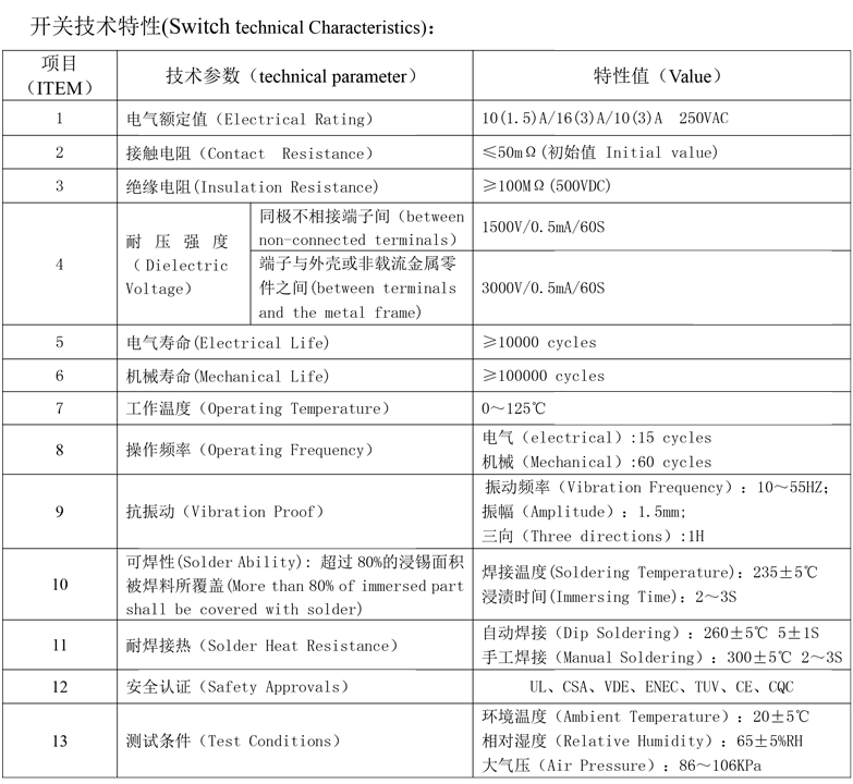 | 1 | Електрични рејтинг | 10(1,5)A/16(3)A/10(3)A 250VAC | |